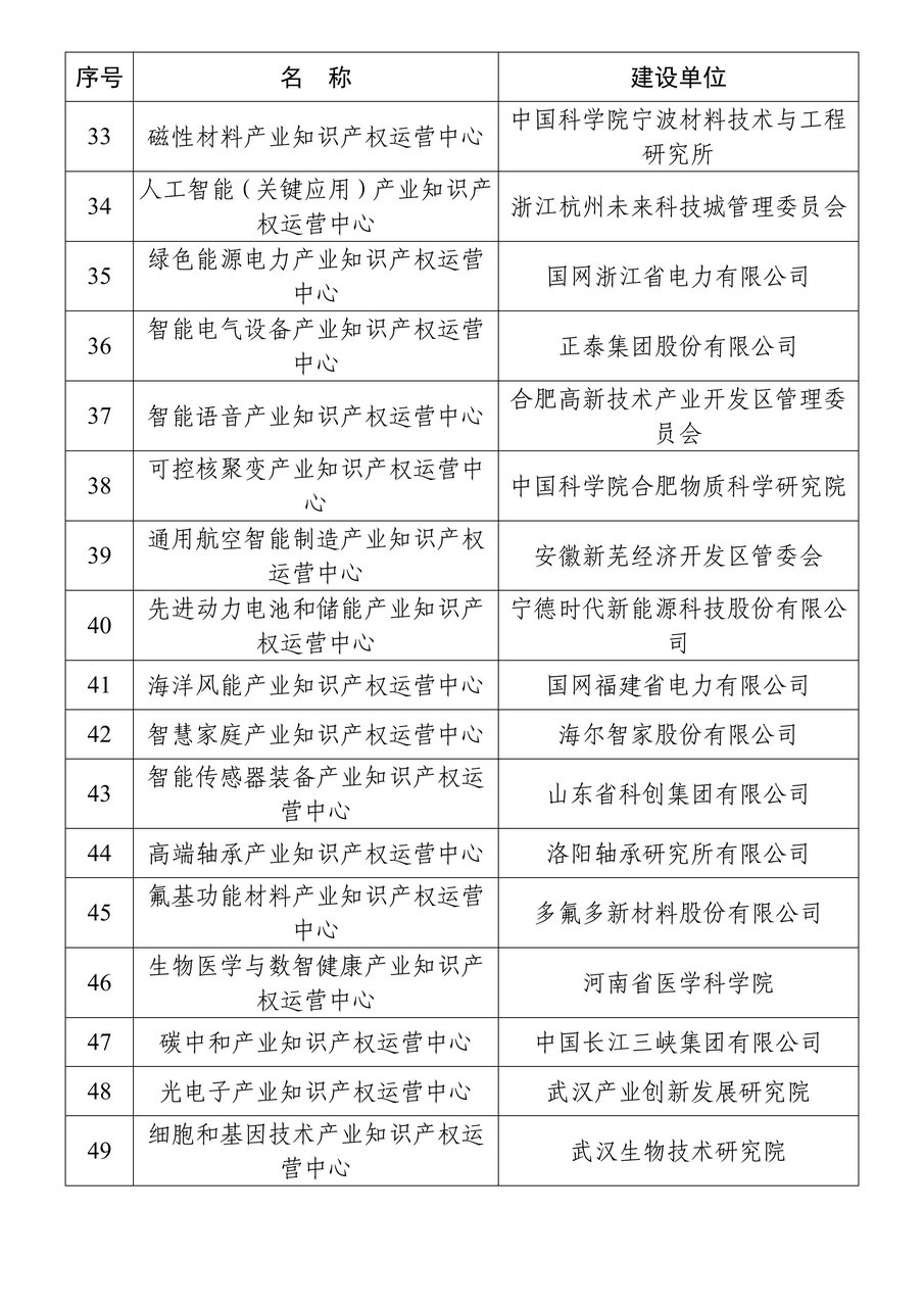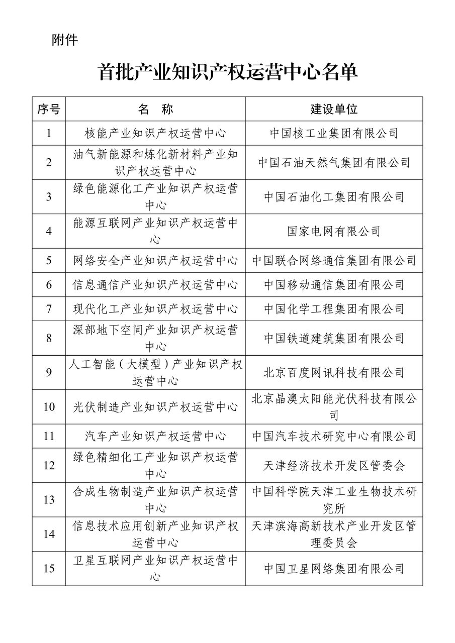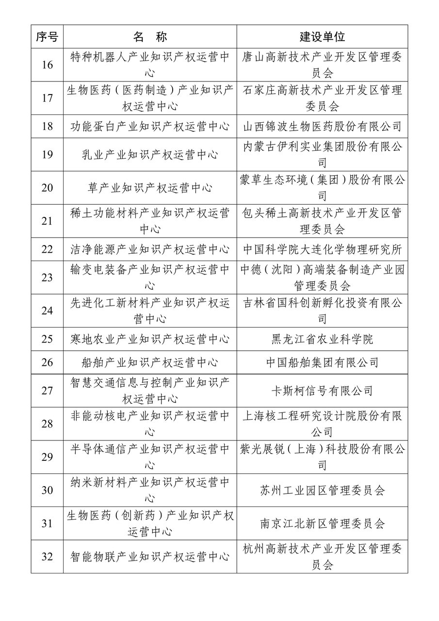 按照《产业知识产权运营中心建设管理工作指引(暂行)》,国家知识产权局组织开展了产业知识产权运营中心申报认定工作,经申报、推荐、评审、公示等程序,确定首批产业知识产权运营中心名单,现予以公布。